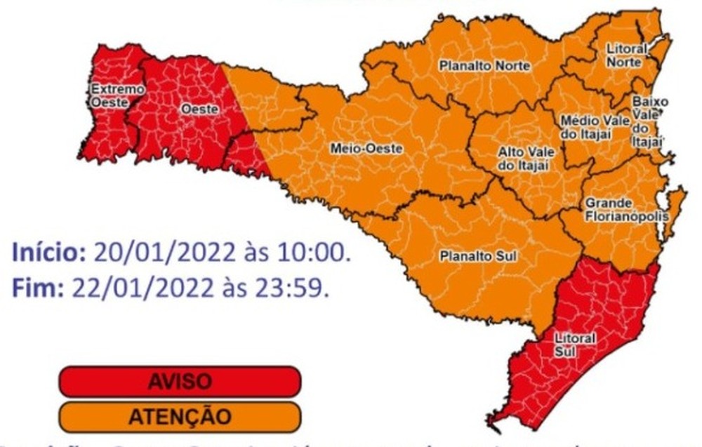 Conforme o comunicado, a onda de calor está prevista até a noite de sábado (22). Pela persistência das altas temperaturas, a condição é de aviso especial para as cidades do Oeste e também no Sul catarinense. As regiões da Grande Florianópolis, Norte e Serra estão em atenção (veja o mapa abaixo).