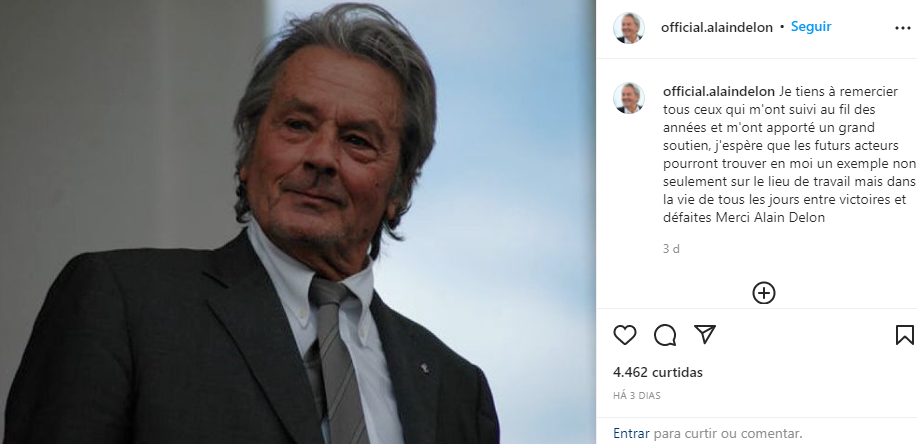 “Gostaria de agradecer a todos que me acompanharam ao longo dos anos e me deram grande apoio, espero que futuros atores possam encontrar em mim um exemplo não só no local de trabalho, mas na vida de todos os dias, entre vitórias e derrotas”, diz a breve mensagem, em francês. “Obrigado, Alain Delon.”