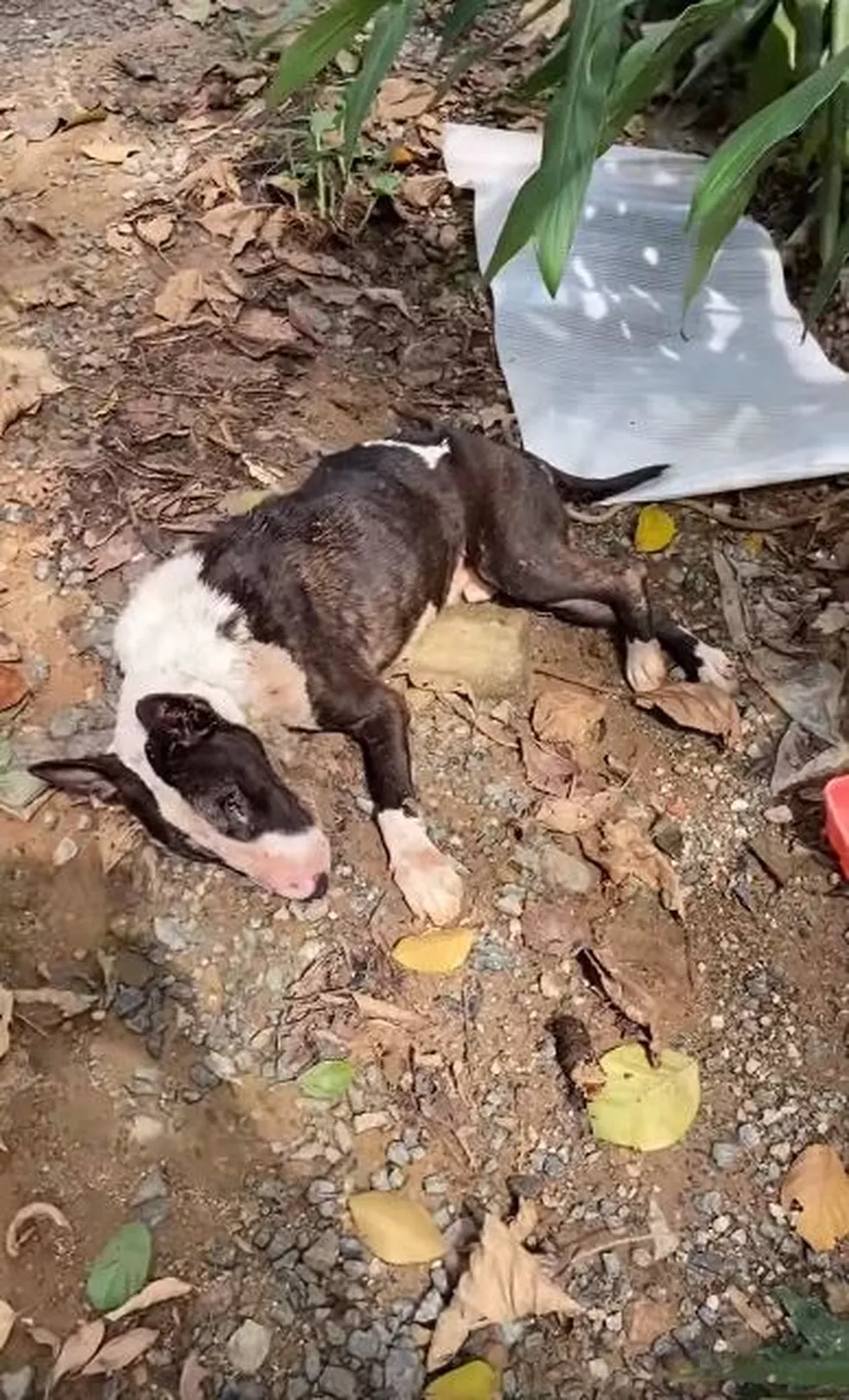 O cachorro, da raça Bull terrier, foi encontrado debilitado e com carrapatos pelo corpo. “Ele estava amarrado no meio do mato e só levantou quando coloquei um pouco de ração pra ele”, disse a presidente da Apajoi, Marli Piekarski.
