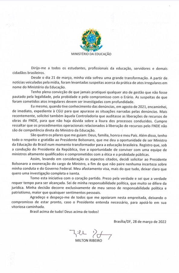 Nacional – Milton Ribeiro pediu demissão do Ministério da Educação (MEC). Ele foi oficialmente exonerado pelo presidente Jair Bolsonaro (PL) nesta segunda-feira, 28 de março.