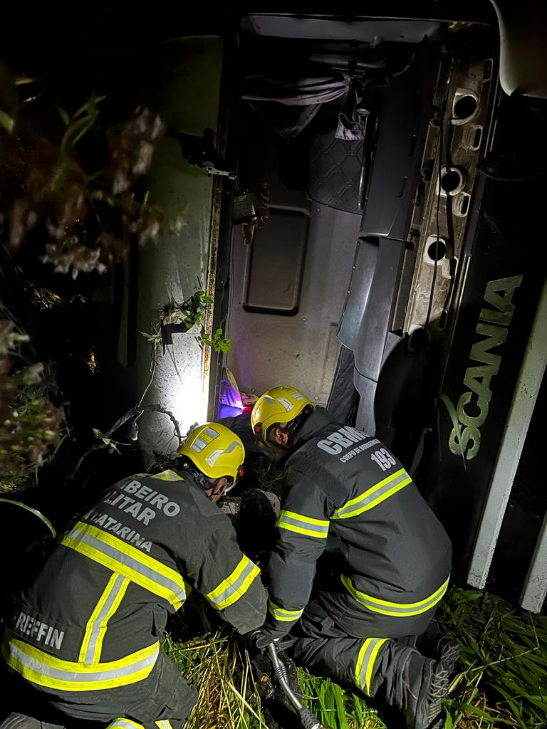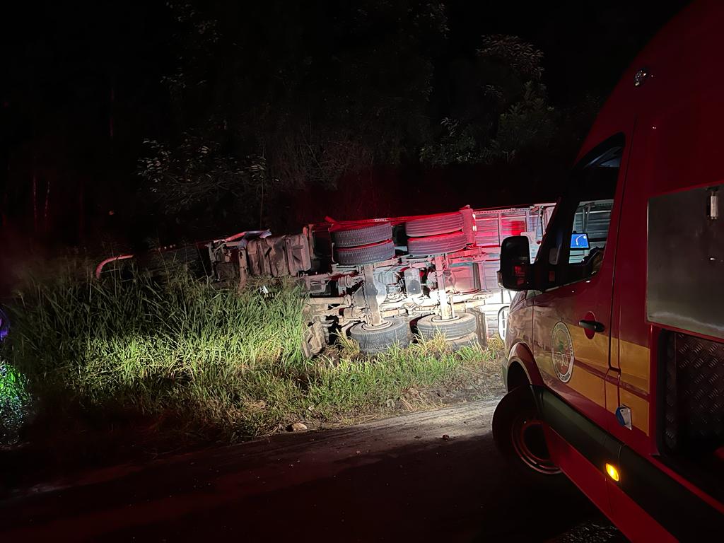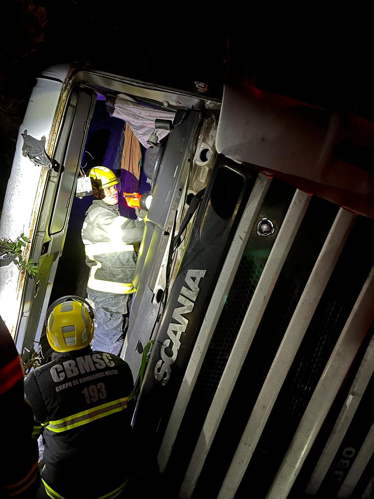 O veículo estava tombado e lateralizado sobre a via de rolamento, com uma vítima de 43 anos de idade no interior da cabine, encarcerado, com politraumatismo e com ausência total dos sinais vitais.