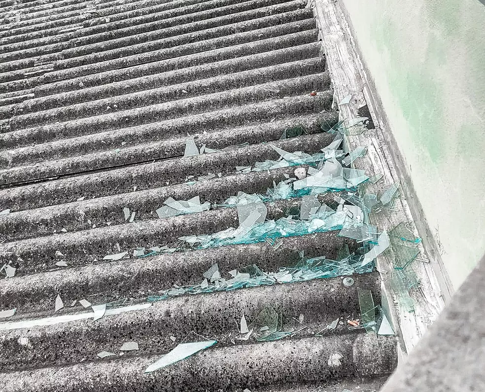 Imagens registradas pela GM mostram a janela de vidro de um dos cômodos do apartamento quebrada. Os estilhaços foram parar no telhado que fica abaixo da janela.