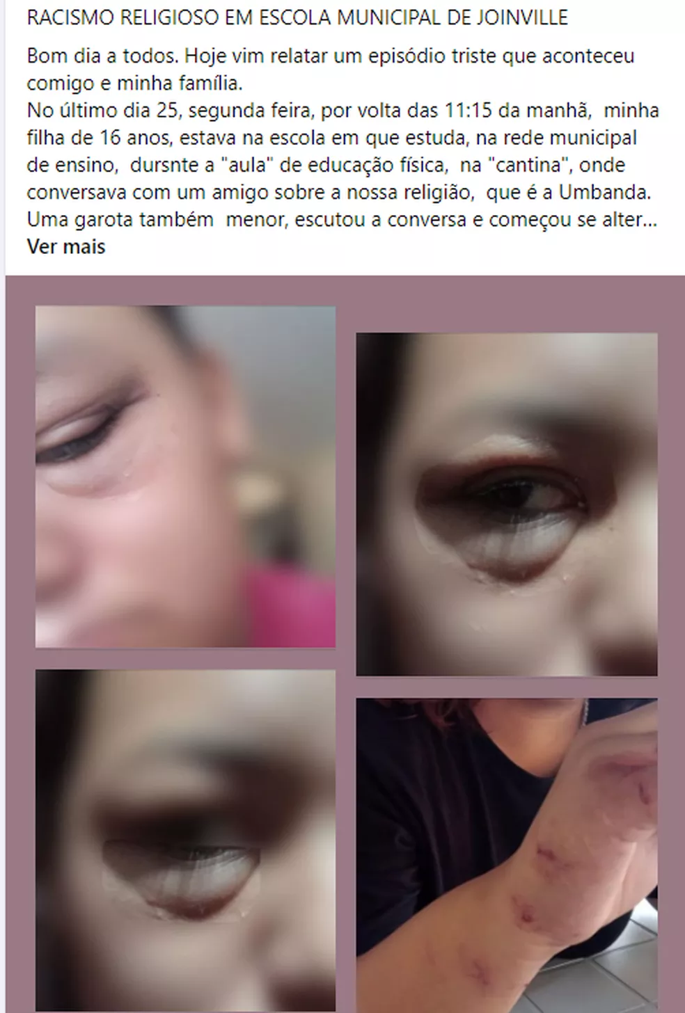 “Minha filha, por sua vez, tentou explicar que ela estava errada e que a religião de Umbanda pregava o bem. Os insultos continuaram chegando às vias de fato, e minha filha foi agredida física e moralmente”, publicou Pricylla, em uma rede social, na quarta-feira (27). A menina teria ouvido que a religião dela “era do demônio”.