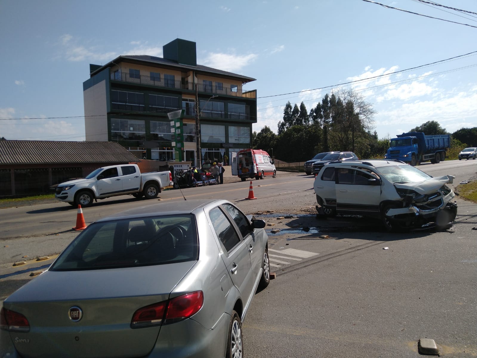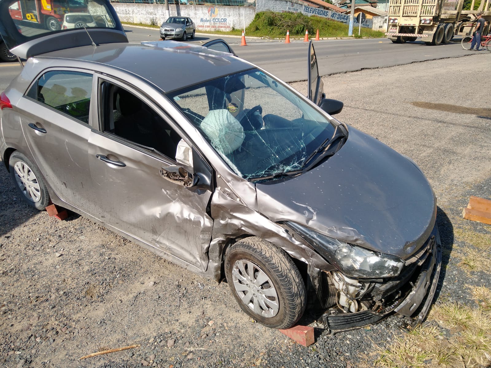 Em outro carro, um V3- HB20 placas São Bento do Sul estava a condutora, uma mulher de 42 anos, encontrada sentada no banco do motorista, consciente e orientada com dores na região pélvica e centro do tórax. Feito o protocolo com uso de colar cervical e maca rígida a mesma foi retirada em ângulo zero pelo porta malas e entregue à unidade do SAMU de Rio Negrinho.