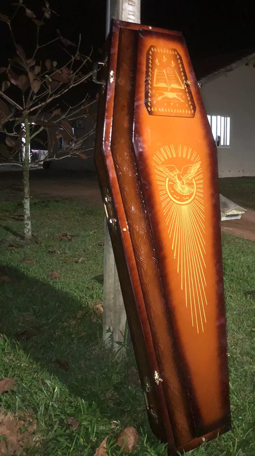 O caixão deixado na frente da residência estava novo e vazio. A polícia apreendeu o objeto, que foi deixado aos cuidados de um fiel depositário, uma funerária que irá guardar o caixão enquanto a investigação prossegue