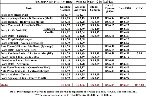 A média de preço dos combustíveis ficou de R$ 4,78 (gasolina comum), R$ 4,86 (gasolina aditivada), R$ 3,98 (etanol), R$ 6,35 (diesel comum S500), R$ 6,45 (diesel s10) e R$ 5,89 (GNV). Lembrando que há diferenciação de valores de acordo com a forma de pagamento, autorizada pela lei 13.455, de 26 de junho de 2017.