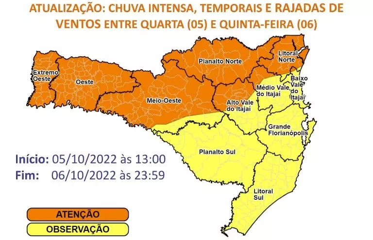 O fenômeno vem acompanhado de chuva intensa em curto intervalo de tempo, temporais com intensas rajadas de vento, raios e eventual queda de granizo, principalmente no Grande Oeste, Norte e áreas isoladas do Vale do Itajaí, onde o risco é moderado a alto para ocorrências associadas ao clima.