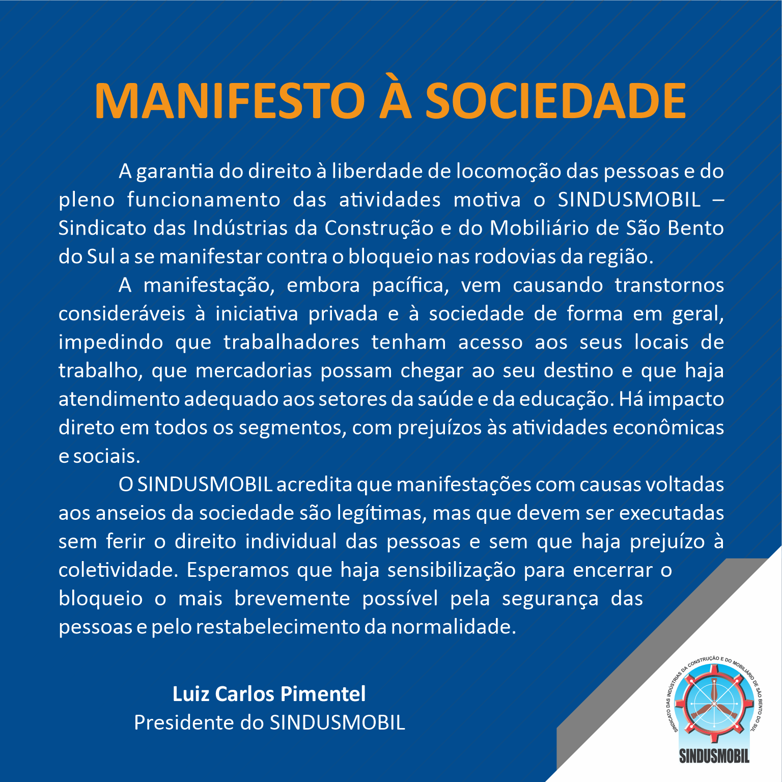 São Bento do Sul – O Sindusmobil (Sindicato das Indústrias da Construção e do Mobiliário de São Bento do Sul )divulga manifesto sobre o bloqueio das rodovias.