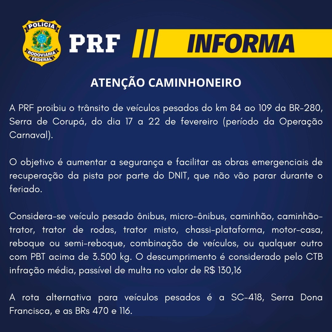 Corupá: Na quinta-feira (16), a Polícia Rodoviária Federal (PRF), em Santa Catarina publicou uma portaria proibindo o trânsito e circulação de veículos pesados na BR-280, do km 84 ao km 109, do dia 17 de fevereiro até o dia 22 de fevereiro de 2023, durante o período da Operação Carnaval.