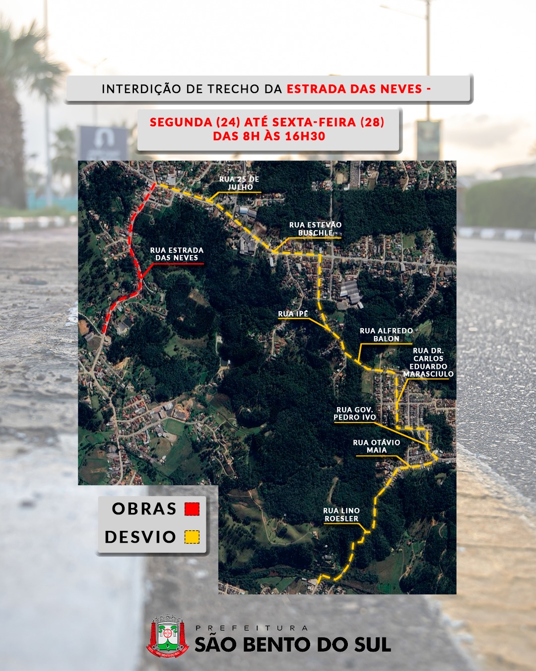 São Bento do Sul – A empresa responsável pelos trabalhos na Estrada das Neves vai interditar a via a partir desta segunda-feira (24) até sexta-feira (28).