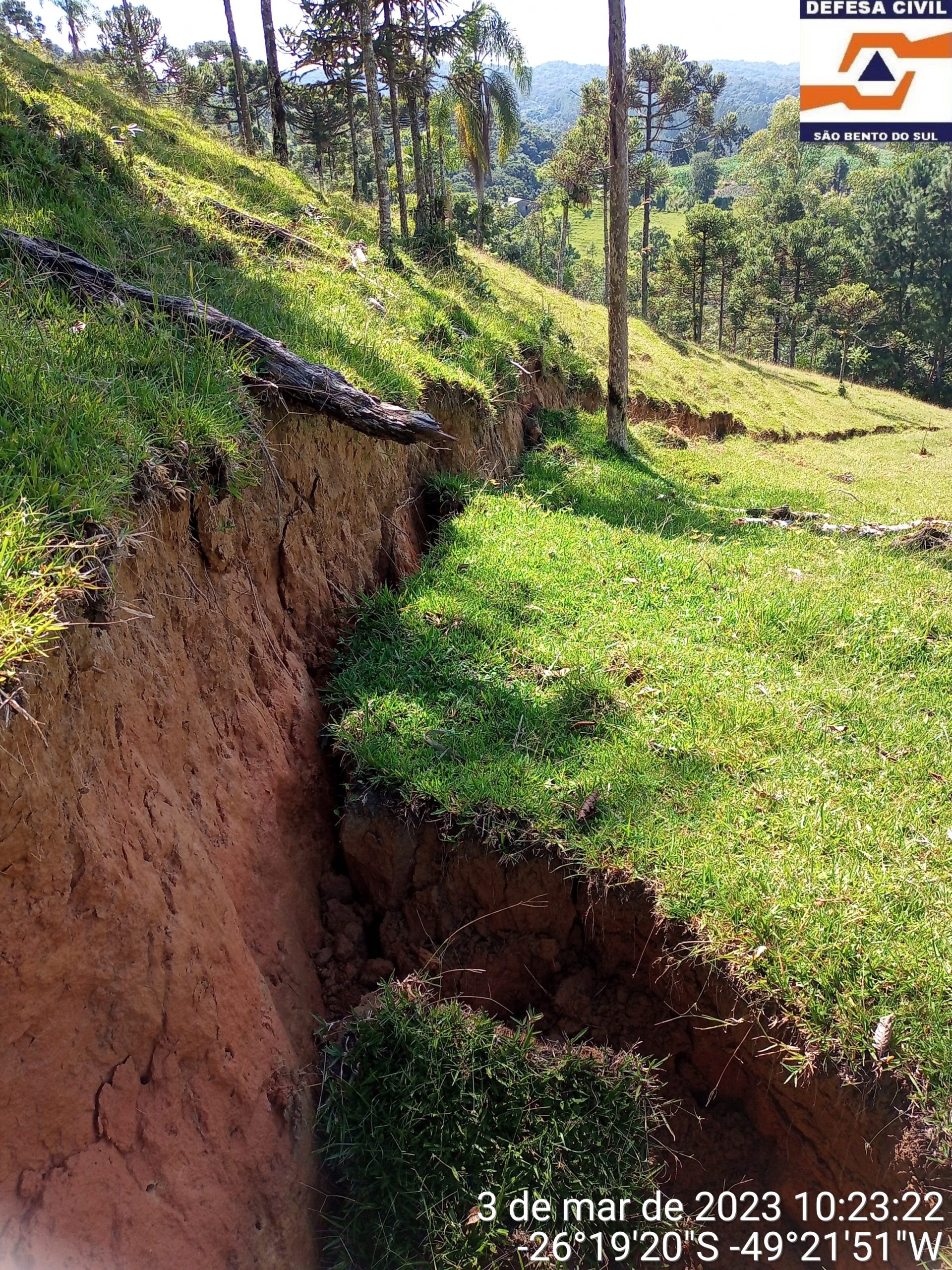 São Bento do Sul – Na segunda-feira (10), o geólogo da Defesa Civil do Estado, Matheus Klein Flach, entregou o parecer técnico que apresentou as avaliações de risco na Estrada dos Bugres, no bairro Serra Alta. Devido às fortes chuvas registradas no final de fevereiro, um trecho da via, próximo à entrada do recanto Buger Strasse, apresentou rachaduras na encosta de um terreno lateral e também na rua, onde há risco de deslizamento. A via está interditada para o tráfego.