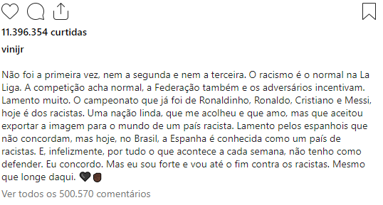 Após a partida, o presidente da liga espanhola, Javier Tebas, minimizou a conduta dos torcedores e culpou Vini Jr. por “não comparecer a reuniões que tratariam do assunto”. O atacante brasileiro desabafou nas redes sociais.