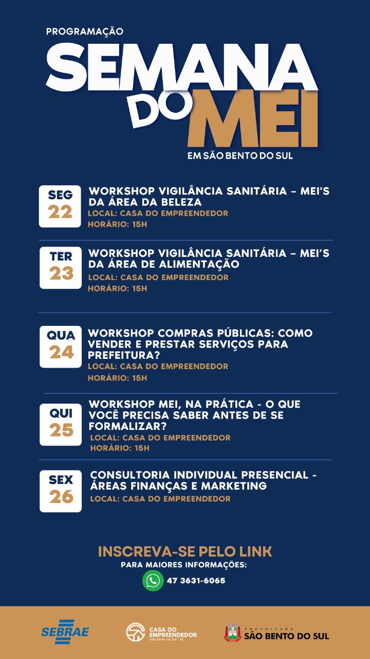 São Bento do Sul se prepara para receber a Semana do Microempreendedor Individual (MEI). Dedicado ao desenvolvimento e capacitação dos empreendedores locais, o evento é promovido pela Prefeitura, por meio da Secretaria de Desenvolvimento Econômico e Turismo, da Casa do Empreendedor e do SEBRAE.