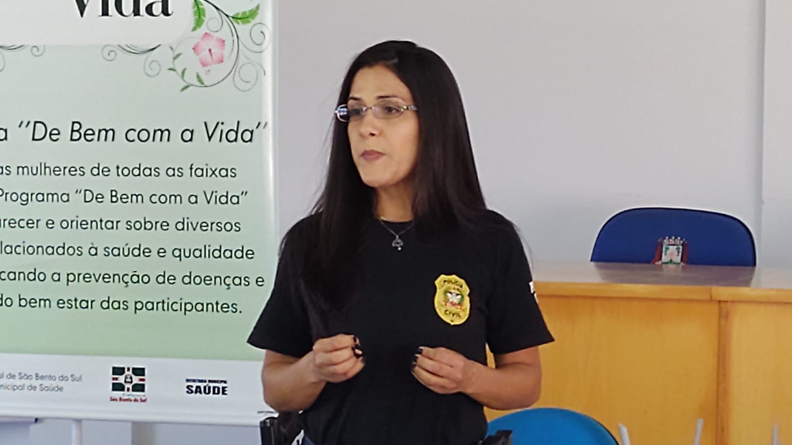São Bento do Sul – Mayara Aparecida Ferreira, Policial Civil que atua diretamente na Delegacia da Mulher em São Bento do Sul, foi uma das convidadas a falar para as mulheres que participaram do programa “Climatério”, promovido pela Secretaria de Saúde na tarde desta quarta-feira (28).