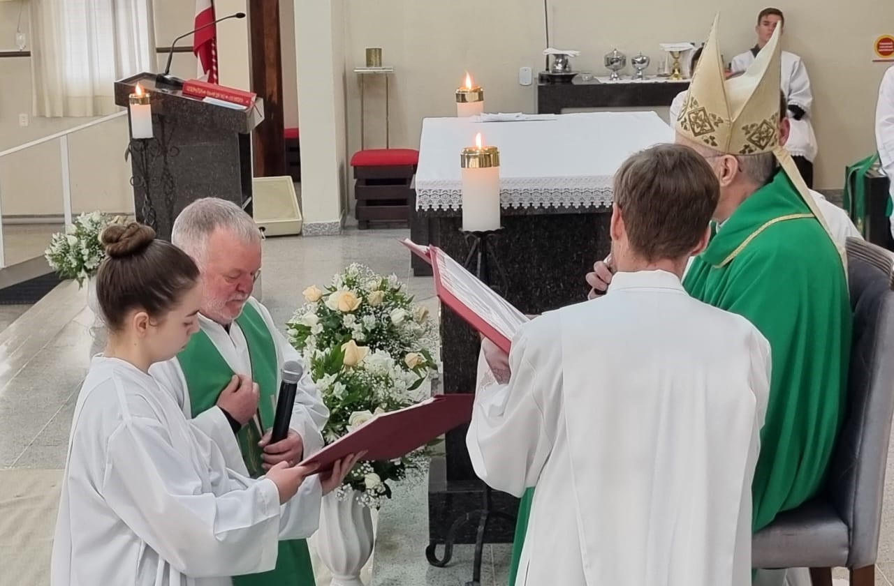 São Bento do Sul – Uma celebração especial foi preparada para a manhã de domingo (23), quando o Bispo da Diocese de Joinville, Dom Francisco Carlos Bach, se fez presente para dar oficialmente posse ao novo Pároco da Igreja São José, em Serra Alta. O Bispo presidente a missa das 8 horas da manhã que contou com a igreja lotada, fato que não acontecia há algum tempo no bairro.