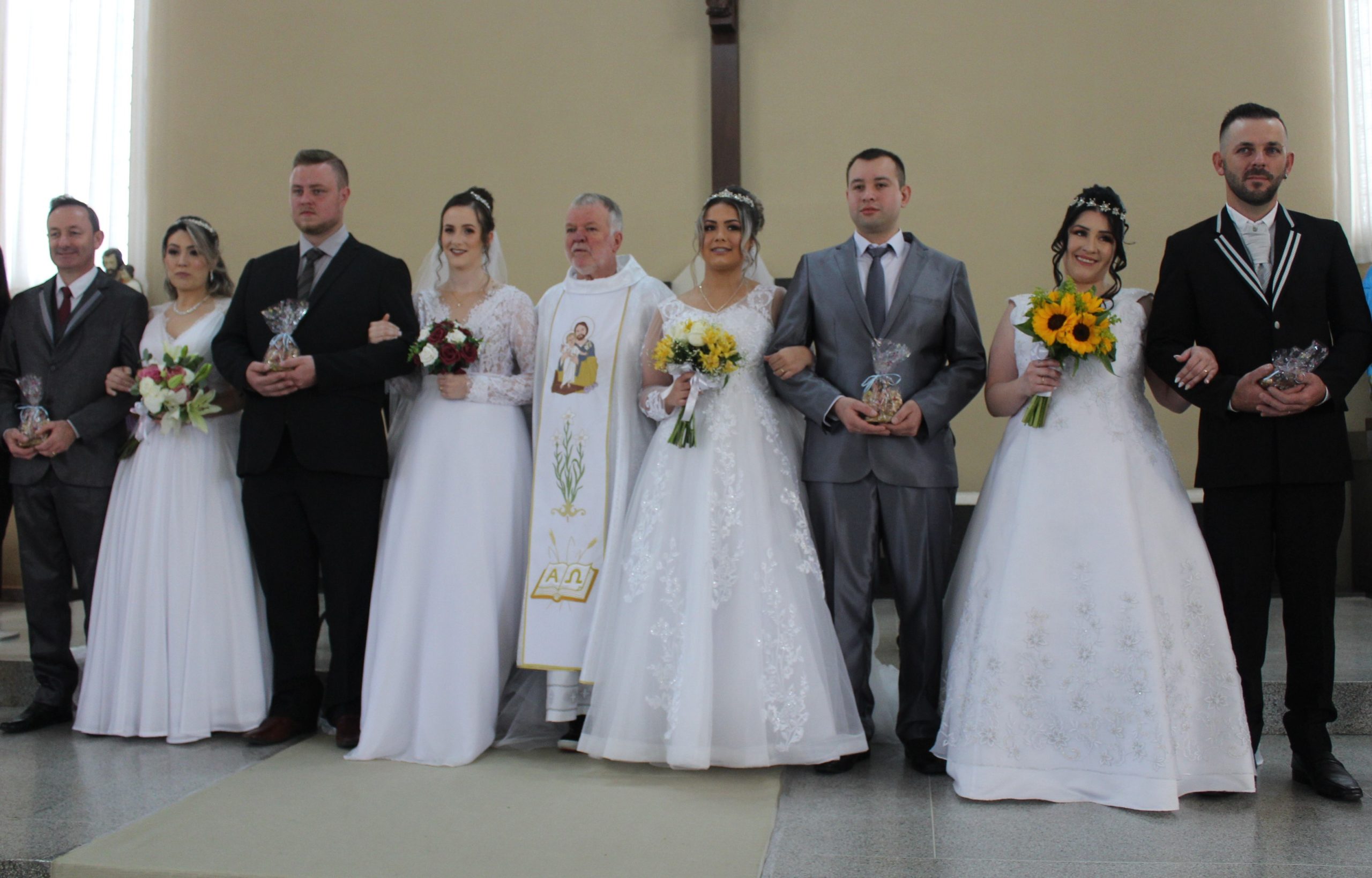 Em uma celebração especial organizada pela Pastoral Familiar, o sacerdote, Padre Humberto Zanini, recebeu os casais Carlos e Andressa, João e Joslaine, Valdemar e Leidi, Everton e Gislaine para a cerimônia. Todos os casais passaram por um período de preparação para o momento de unir em definitivo suas vidas perante Deus e perante a igreja. “Casamento é sempre motivo de alegria, afinal é o começo de uma nova família. Temos certeza que a família é o berço de todas as coisas boas para a nossa vida, por isso a importância da presença do pai e da mãe em todos os momentos. Aqui começaram quatro novas famílias que receberam a benção e o apoio da igreja sob olhares e amigos, familiares e especialmente os pais”, disse o sacerdote.