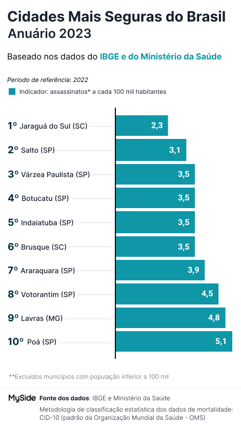 No levantamento, Brusque aparece em sexto lugar. Santa Catarina também foi considerado o Estado mais seguro e, Florianópolis, a capital com menor taxa de homicídios a cada 100 mil habitantes. Para o ranking, são considerados dados do Ministério da Saúde e do Censo 2022 do IBGE.