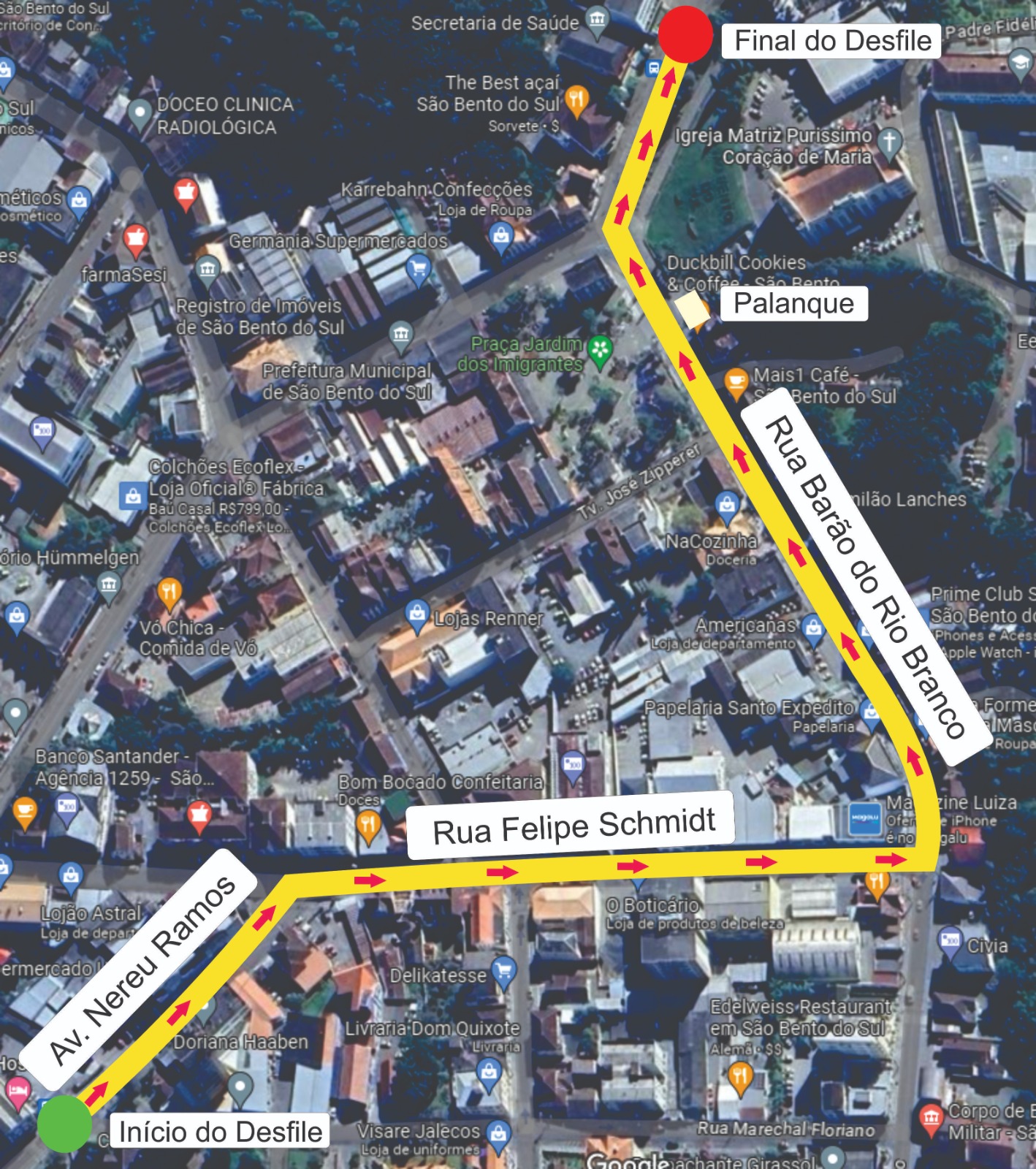 A solenidade de abertura do desfile alegórico de 150 anos será em um palco em frente à escadaria da Igreja Matriz Puríssimo Coração de Maria, a partir das 9 horas. A concentração do desfile será na Sociedade Desportiva Bandeirantes a partir das 8h30, com saída às 9h30 na rua Felipe Schmidt em frente, ao escritório da Celesc. As ruas laterais do Centro vão operar com esquema especial de trânsito, orientado pelo Departamento de Trânsito Urbano (Detru).