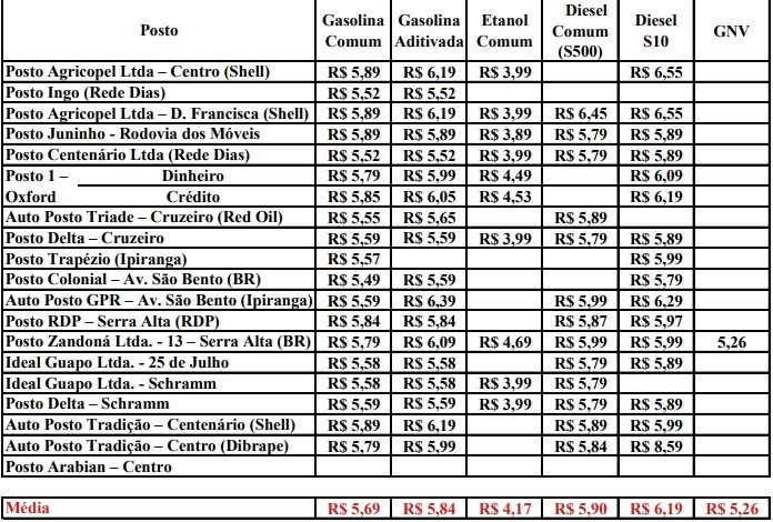 A última pesquisa, realizada no dia 11 de outubro, mostra os seguintes valores na média de preço: R$ 5,89 (gasolina comum), R$ 6,03 (gasolina aditivada), R$ 4,22 (etanol), R$ 5,92 (diesel comum S500), R$ 6,05 (diesel s10) e R$ 5,26 (GNV).