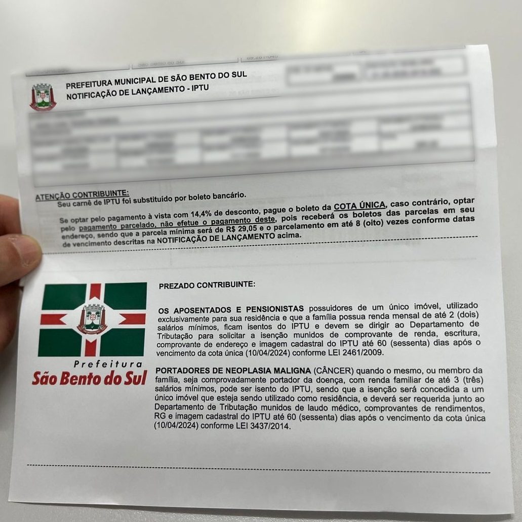São Bento do Sul – A Prefeitura, através do Departamento de Receita da Secretaria de Finanças, informa aos contribuintes que o Imposto Predial Territorial Urbano (IPTU) estará disponível para pagamento a partir do dia 1 de fevereiro. Para acessar o seu carnê do IPTU 2025, basta fazer a retirada do documento pelo site saobentodosul.atende.net, ou ainda, aguardar a entrega via Correios.