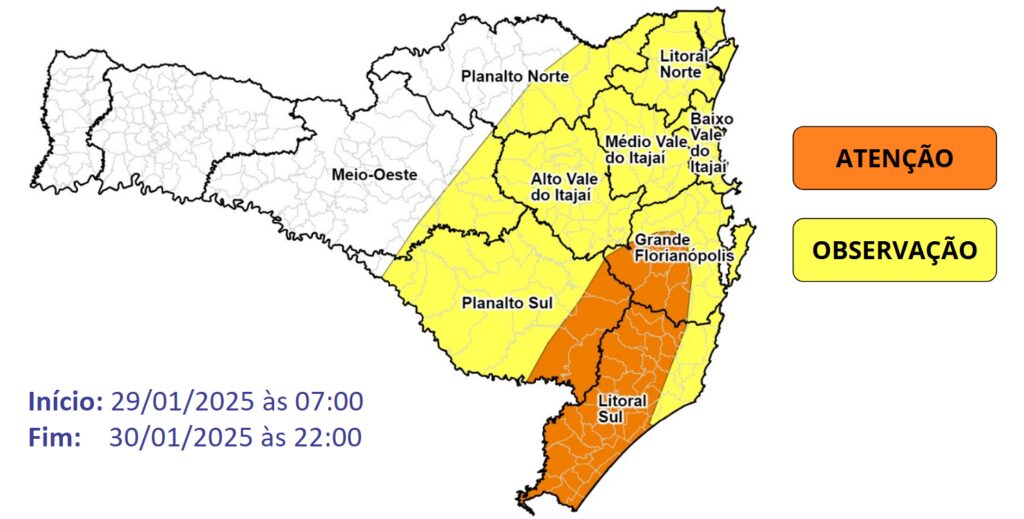 Estadual – A partir desta quarta-feira (29) o estado de Santa Catarina entra em alerta para o risco de chuvas intensas e alagamentos.