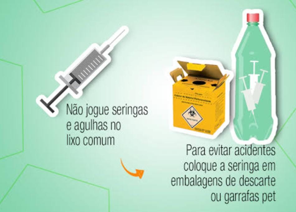 Quando precisar se desfazer de qualquer um desses itens, leve-os até a Unidade de Saúde do seu bairro. Nossa equipe está pronta para garantir que o descarte seja feito de maneira segura e adequada. Os materiais devem ser embalados separadamente.  Restos de remédios e uma sacola, restos de curativos em outra e os materiais perfurocortantes em uma caixinha ou em uma garrafa pet.