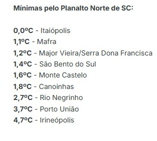 Conforme dados meteorológicos da Sigma Estações Meteorológicas, a menor temperatura foi registrada na cidade de Itaiópolis, exato zero grau, seguida de Mafra que registrou 1,1 e Major Vieira, assim como na região da Serra Dona Francisca, a temperatura de 1,2 graus.