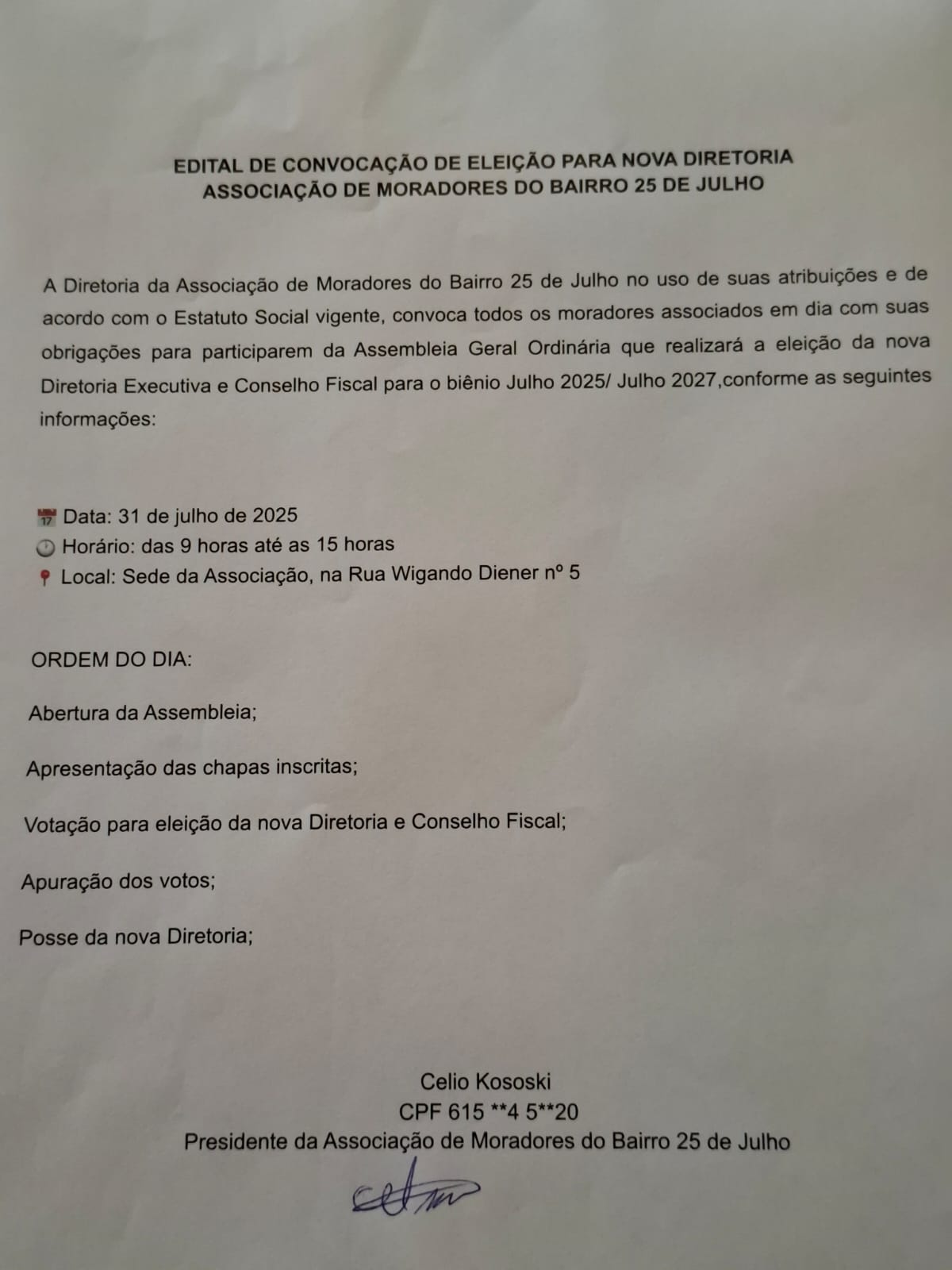 São Bento do Sul – Uma ação, no mínimo, estranha. Associação dos Moradores do bairro 25 de Julho terá sua eleição para definir a nova diretoria na quinta-feira (31) com votação aberta das 9 às 15 horas. Algumas pessoas, que pediram pra não serem identificadas, entraram em contato com O Jornaleiro questionando o direcionamento que se deu ao processo que terá desfecho em horário onde a maioria dos moradores estará trabalhando.