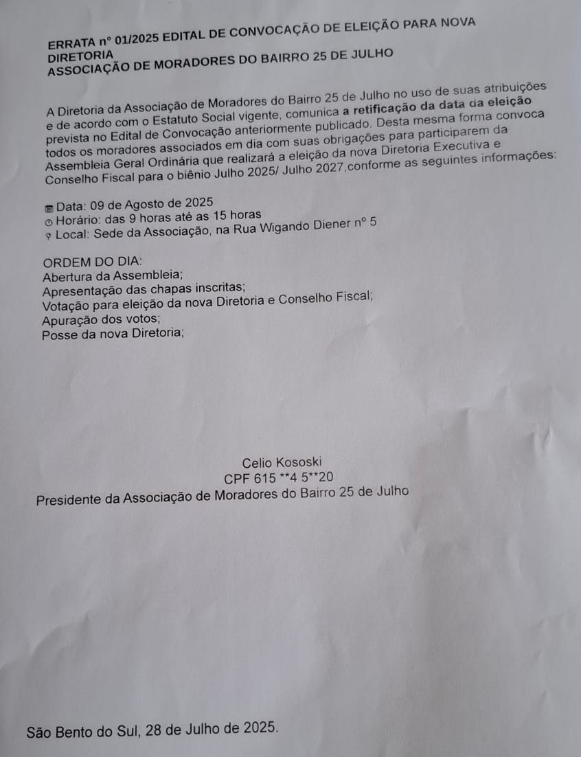 São Bento do Sul – Tão logo foi publicada a notícia por O Jornaleiro na manhã de quarta-feira (30), sobre votação para eleger a nova diretoria da Associação de Moradores do bairro 25 de Julho, que estava marcada para quinta-feira (31), das 9 às 15 horas, pressões fizeram com que o processo tivesse alteração.