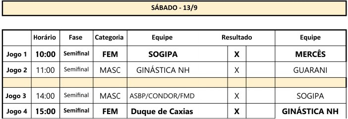 No sábado, os jogos semifinais começam às 10 horas e no domingo a disputa de 3º e 4º com início às 9 horas. No masculino a decisão ocorre às 10h30 e pelo naipe feminino o jogo decisivo começa às 12 horas.