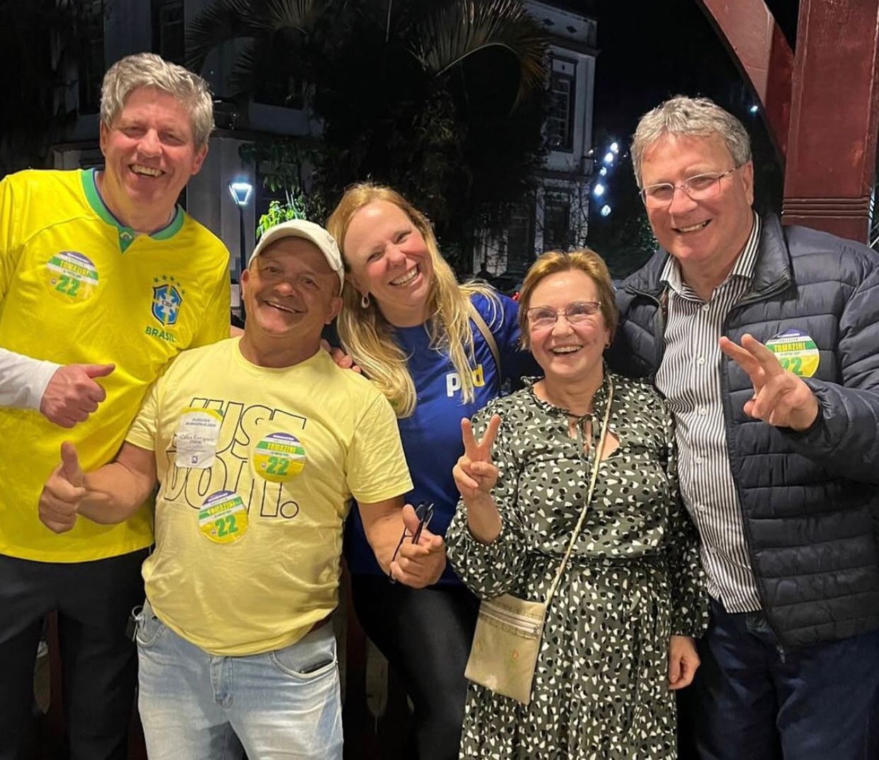 A vereadora Cátia Friedrich (PSD) comemorando o primeiro ano desde o resultado nas urnas. Na foto, registro de quando haviam motivos para planejar o futuro em parceria com o PL, de Antônio Tomazini. Atualmente, o distanciamento está mais claro.